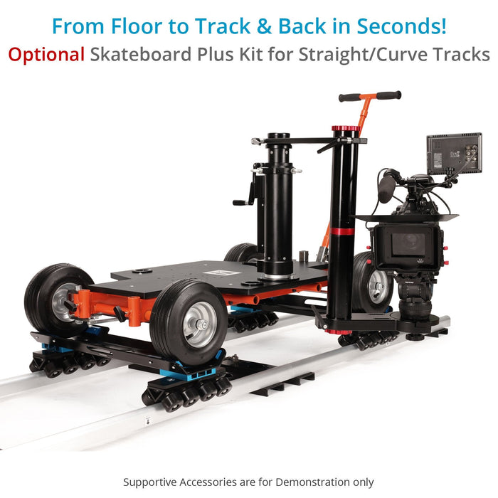 Equip your Quad Dolly with the included Track Wheels Set for use on tracks or with the Pneumatic Wheels for standard floor use. One can also use it with a Tripod, a Bazooka, a Slider, or any Euro-compatible accessory and configure it for their needs.