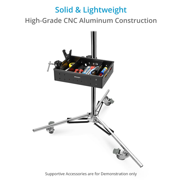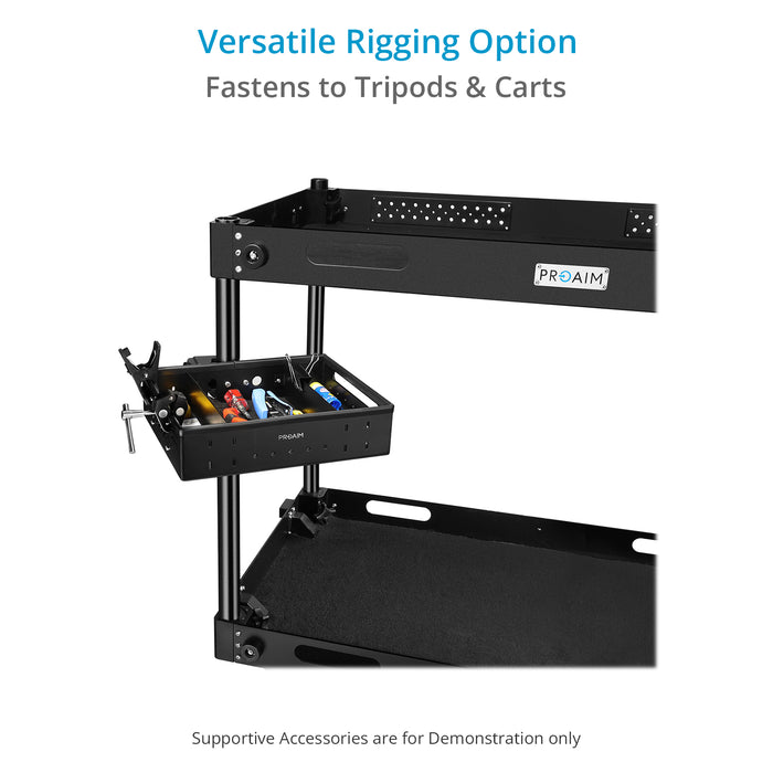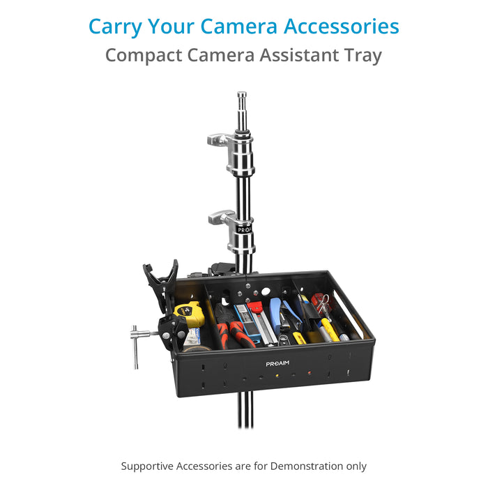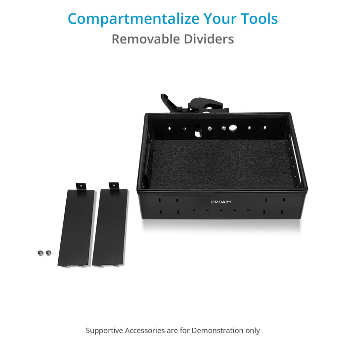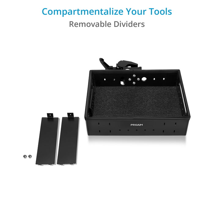 Carefully crafted for camera assistants, this Proaim Front Tray resourcefully manages and efficiently holds miscellaneous tools found in small production houses to permit quick & easy accessibility.