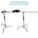 We provide Universal Track Ends with Baby stand receivers with 5/8" Baby Pin in the Polaris dolly, you can use any C-Stands and the same mounting tripod stands.