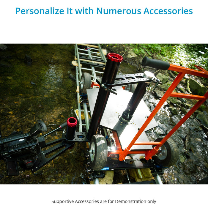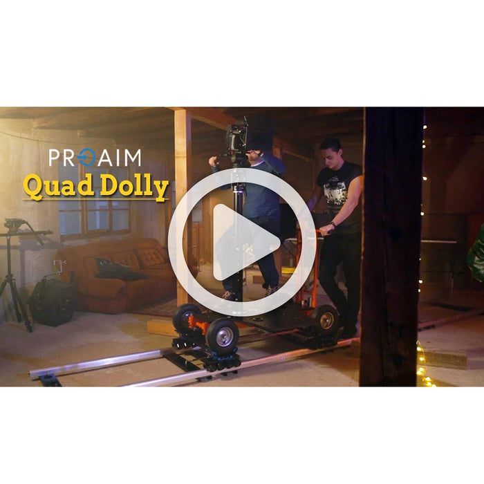 Quad Dolly can be equipped with Skateboard Wheels or Standard Track Wheels for use on tracks or Pneumatic Wheels for standard floor use. You can use a tripod, a bazooka, a slider, or any other standard Euro Mount Accessory and configure it your needs.