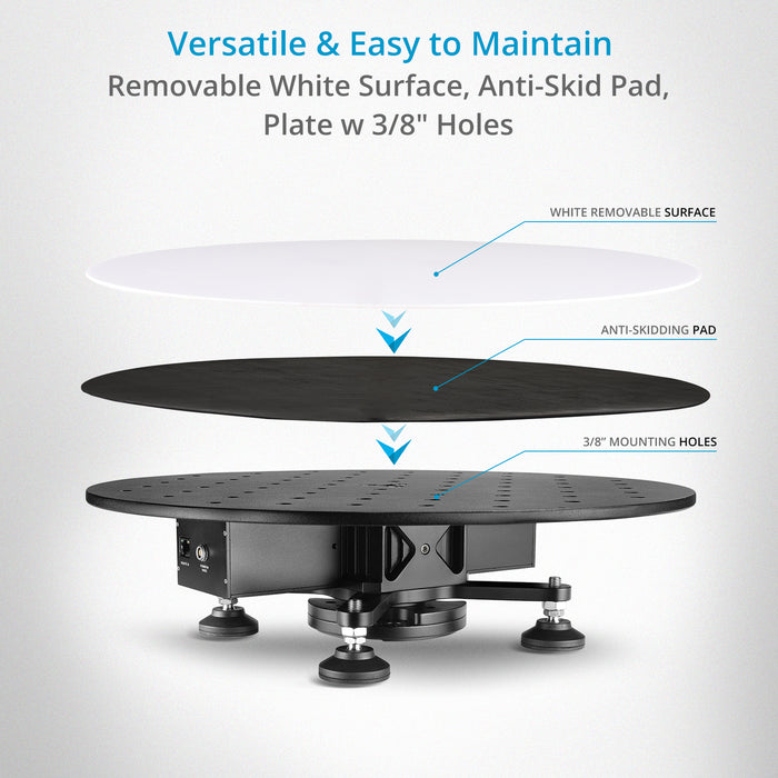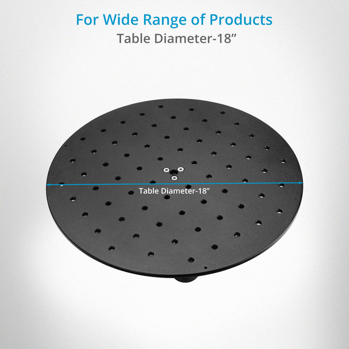 The Proaim Turntable features a removable white top surface for effortless cleaning and replacement, while the anti-skid pad underneath ensures stability. With an 18" diameter, it accommodates a variety of products and fits seamlessly into desktop lightboxes. The aluminum plate beneath is equipped with 3/8" holes, offering versatile mounting options for products or additional grip equipment.